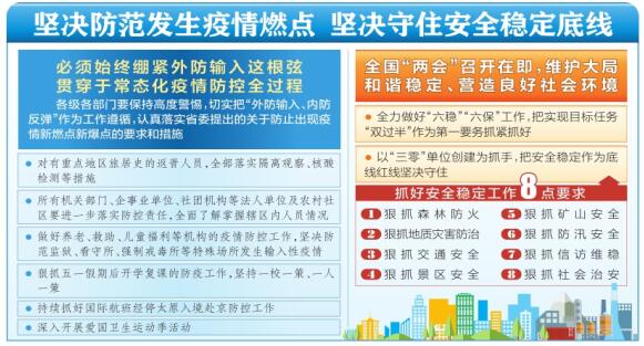 楼阳生强调,全国两会召开在即,维护大局和谐稳定、营造良好社会环境,山西责无旁贷。全省上下要全力做好“六稳”“六保”工作,把实现目标任务“双过半”作为第一要务抓紧抓好;要以“三零”单位创建为抓手,把安全稳定作为底线红线坚决守住,为服务保障全国大局作出山西贡献。他对抓好安全稳定工作提出八点要求。一要狠抓森林防火。严禁一切野外用火,切实管住人头、田头、坟头、源头,对每起森林火灾,既要对肇事者依法查处,也要对工作不落实的责任人严肃问责。二要狠抓地质灾害防治。以村庄、厂矿、公路等周边崩塌、滑坡及高陡边坡隐患为重点,全面加强监测排查和分类处置,坚决杜绝发生群死群伤事故。三要狠抓交通安全。加强对“两客一危”等运输车辆的安全监管,加强高速公路隧道交通安全管理,着力提升道路交通本质安全水平。四要狠抓景区安全。抓紧抓实抓细景区常态化疫情防控措施,加强服务引导和客流管控,保障游客旅游安全。五要狠抓矿山安全。强化企业主体责任、部门监管责任落实,加强煤矿、非煤矿山、尾矿库、头顶坝等重点领域隐患排查和专项整治,加强动态监测管理,坚决防范各类事故特别是重特大安全生产事故发生。六要狠抓防汛安全。对所有水库、河流等进行24小时监测,有针对性地采取预防性措施,做好应急处置准备。各级水利部门党员干部要下沉一线,推动防汛各项举措落实落细。七要狠抓信访维稳。深入开展信访“控新治旧”十项行动、“四个重点领域”攻坚战,推动诉求合理的解决问题到位,诉求无理的思想教育到位,生活困难的帮扶救助到位,行为违法的依法处理,切实把矛盾风险稳控在当地、化解在基层。八要狠抓社会治安。严厉打击各类违法犯罪,坚持露头就打、痛打狠打,保持高压态势,形成强大震慑。各级各部门要提高政治站位,认真履行保卫首都、拱卫京畿的政治责任,看好自家门、管住自家人,守好“责任田”、织密“安全网”,切实当好首都“护城河”,以一域之稳定维护大局之稳定。
