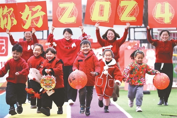图为2023年12月29日,山东省临沂市郯城县郯城街道官塘幼儿园的老师手持“你好2024”字样,和孩子们一起迎接新年。新华社发(张春雷 摄)