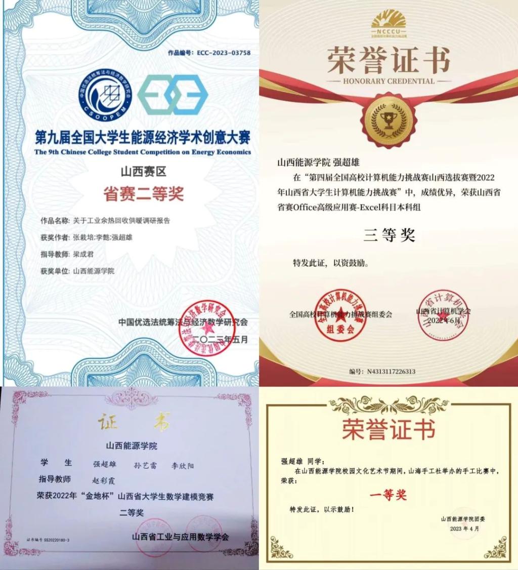 在科研及文体竞赛方面,强超雄获得了第九届全国大学生能源经济学术大赛二等奖、2022年"金地杯"山西省大学生数学建模竞赛二等奖、2023年第十八届挑战杯大赛校级一等奖、第四届全国高校计算机能力挑战赛山西选拔赛暨2022年山西省大学生计算机能力挑战赛Office高级应用赛—Excel科目本科组三等奖、校园文化艺术节手工比赛校赛一等奖以及创意书签活动校赛三等奖。