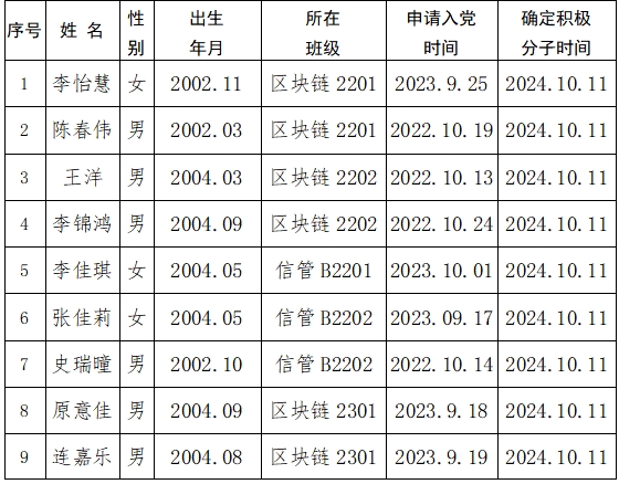 按照《山西省高等学校发展学生党员工作实施细则》要求,根据群团组织推优情况,经计算机与信息工程系学生党支部大会研究讨论,拟确定李怡慧、陈春伟等23名共青团员为积极分子。现对拟确定的入党积极分子基本情况予以公示,公示期为5个工作日,自2024年10月12日—2024年10月17日。
