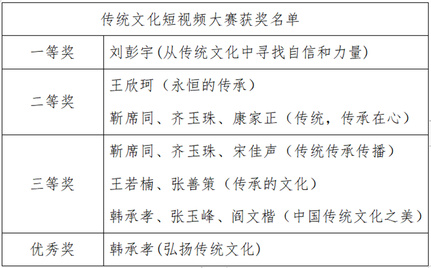 传统文化短视频大赛需要参赛同学制作与主题相结合的短视频,最终提交作品。在参评现场通过依次播放短视频,参议人员现场打分,评出一等奖一组、二等奖两组、三等奖三组和优秀奖若干。