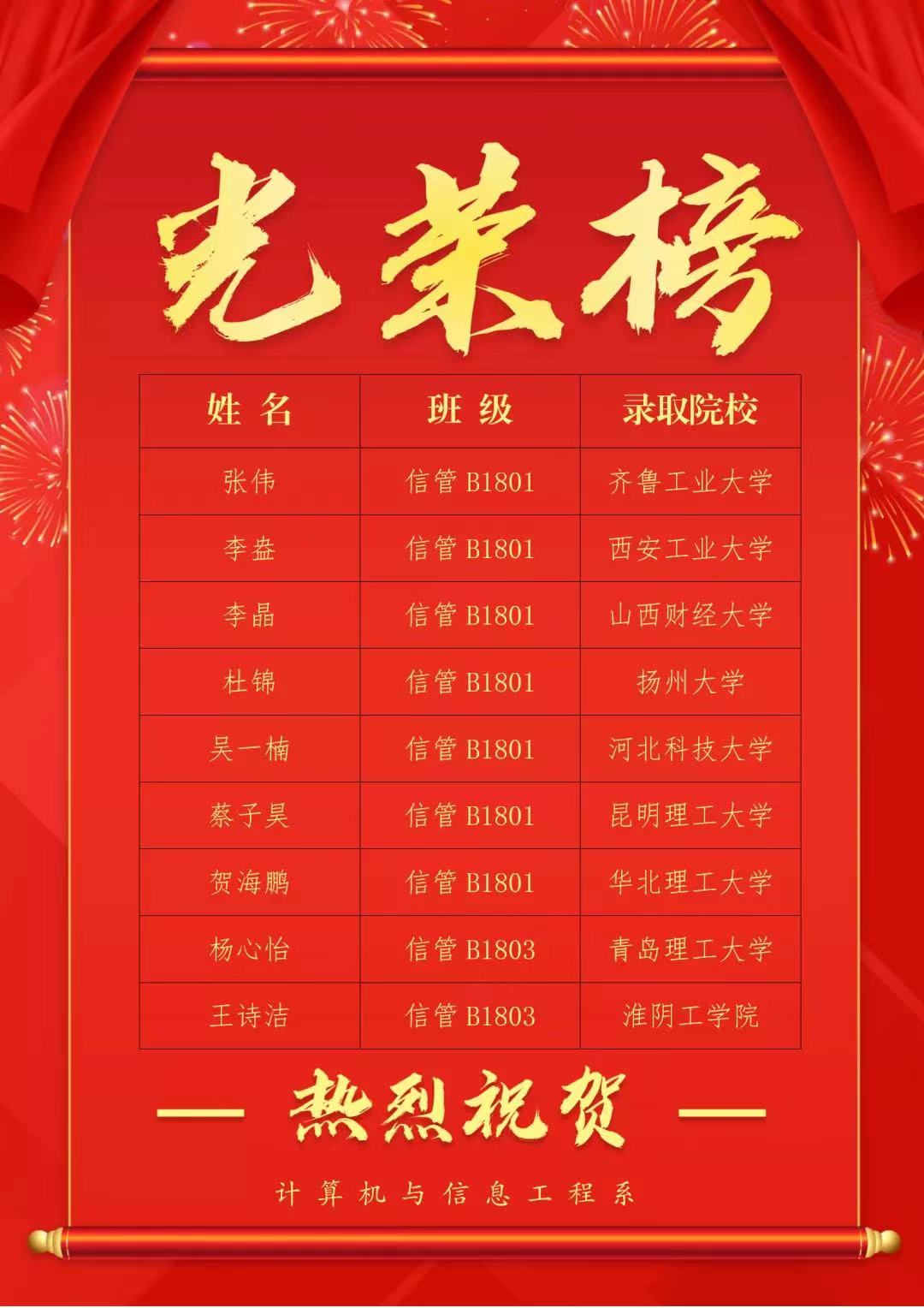 再一次衷心祝福每一位考研成功的学子,你们的努力没有白费,你们的未来无限光明。同时也希望我们在校的计算机系学子,能以学长学姐们为榜样,心坚志恒,勇攀高峰!