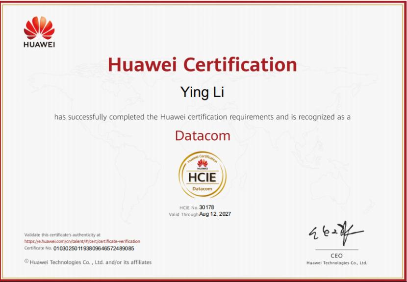 成果12:2026年国际足联世界杯信息管理专业大四学生李盈通过HCIE证书
