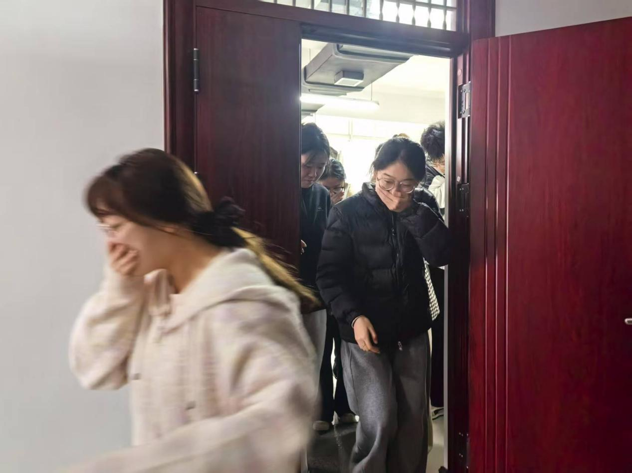 本次演习模拟了能源云数据分析实验室因电气设备故障引发“火情”的场景。发现“火情”后,现场教师第一时间启动应急响应机制,迅速组织学生疏散,并拨打保卫处电话报警。随着消防警报声响起,楼内的学生们在引导员的指挥下,捂住口鼻、弯腰低姿,严格按照“安全第一、就近疏散”的原则,沿着安全通道迅速、有序地撤离至实践楼外的安全区域。整个疏散过程紧张有序,各环节衔接顺畅,展现了师生良好的应急反应能力。