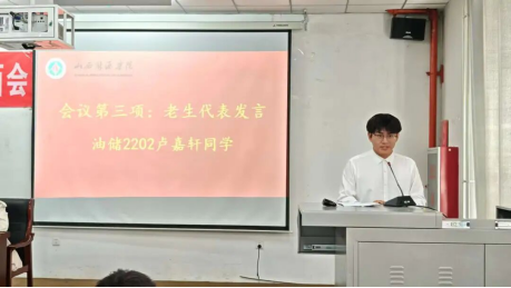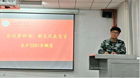 而后,来自学长学姐与新生代表的发言,更是让现场氛围愈发热烈。油储2202班卢嘉轩同学作为老生代表,分享了自己的大学成长故事与实用经验,用“过来人”的视角为新同学避坑指路;采矿2501班李鹏慧同学作为新生代表,表达了对大学生活的期待与规划,道出了全体2025级新生的共同心声。
