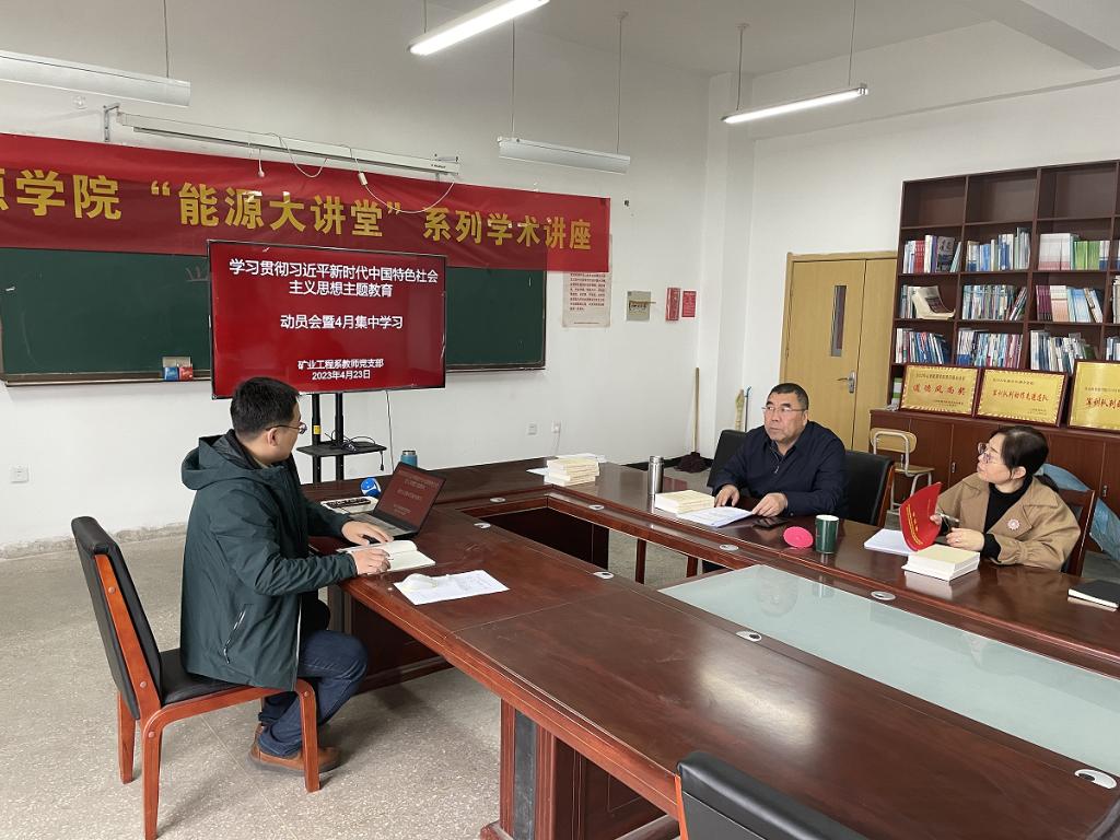 4月23日,矿业工程系党总支组织全体教职工党员召开学习贯彻习近平新时代中国特色社会主义思想主题教育动员会。系党总支书记周根立作了动员讲话,会议由教师党支部主题教育学习领导小组组长潘瑞凯主持。
