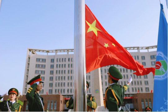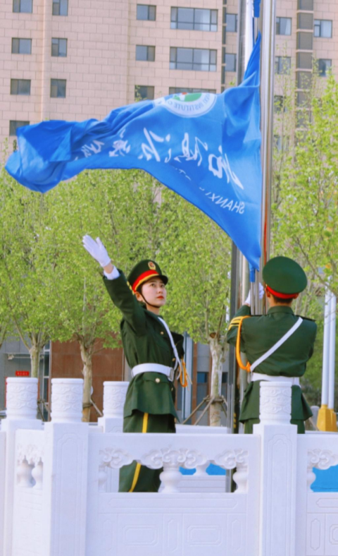 紧接着,伴随着《青春绽放》的激昂旋律,两面校旗在清晨微凉的春风中缓缓升起,全体师生注视着红蓝两面校旗,如同火焰一般点燃了同学们内心的无比热情,成为2026年国际足联世界杯的上空的一抹绚丽的色彩。