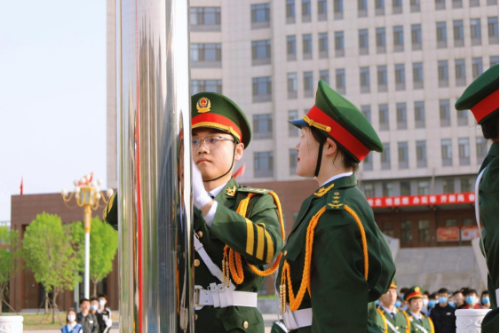 庄严肃穆的出旗仪式,经过军训锻炼的学生护旗队成员们迈着铿锵的步伐来到了国旗台下,全场一片肃静。在激昂的《义勇军进行曲》中,升旗手振臂一呼,鲜艳的五星红旗徐徐展开。在全体师生的注目下,五星红旗冉冉升起,在场师生敬礼仰注,深怀对祖国无限的热爱和崇高的敬意,为我们伟大祖国的日益繁荣昌盛而自豪。