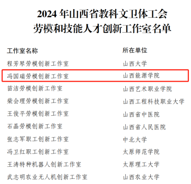 近日,山西省教科文卫体工会委员会下发了《山西省教科文卫体工会关于命名2024年劳模和技能人才创新工作室的决定》(晋教科文卫体工字〔2024〕73号),世界杯官网“冯国瑞劳模创新工作室”成功入选“山西省教科文卫体工会劳模和技能人才创新工作室”。