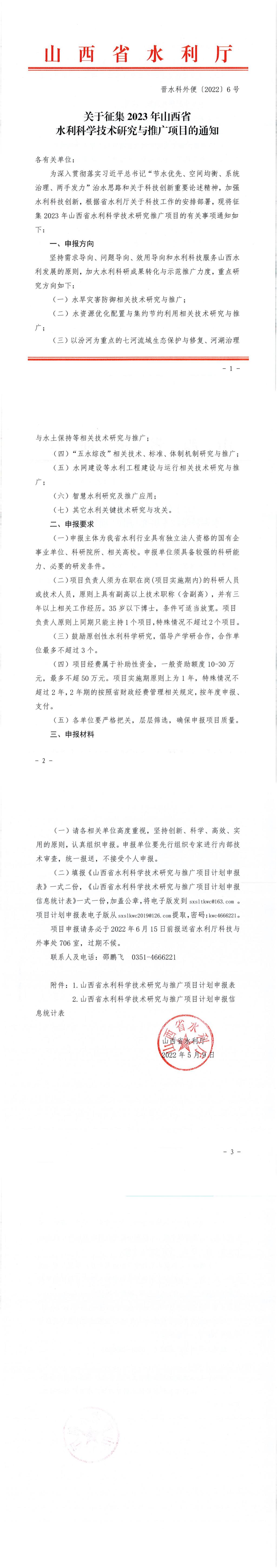 山西省水利厅现征集2023年山西省水利科学技术研究与推广项目,相关要求如下。请符合要求的人员积极申报,并于2022年6月10日前将项目计划申报表(附件2)一式三份和项目申报统计表(附件3)一式一份报送至综合楼7层科技产业部办公室,电子版发送至邮箱:kjcyb@sxie.edu.cn。