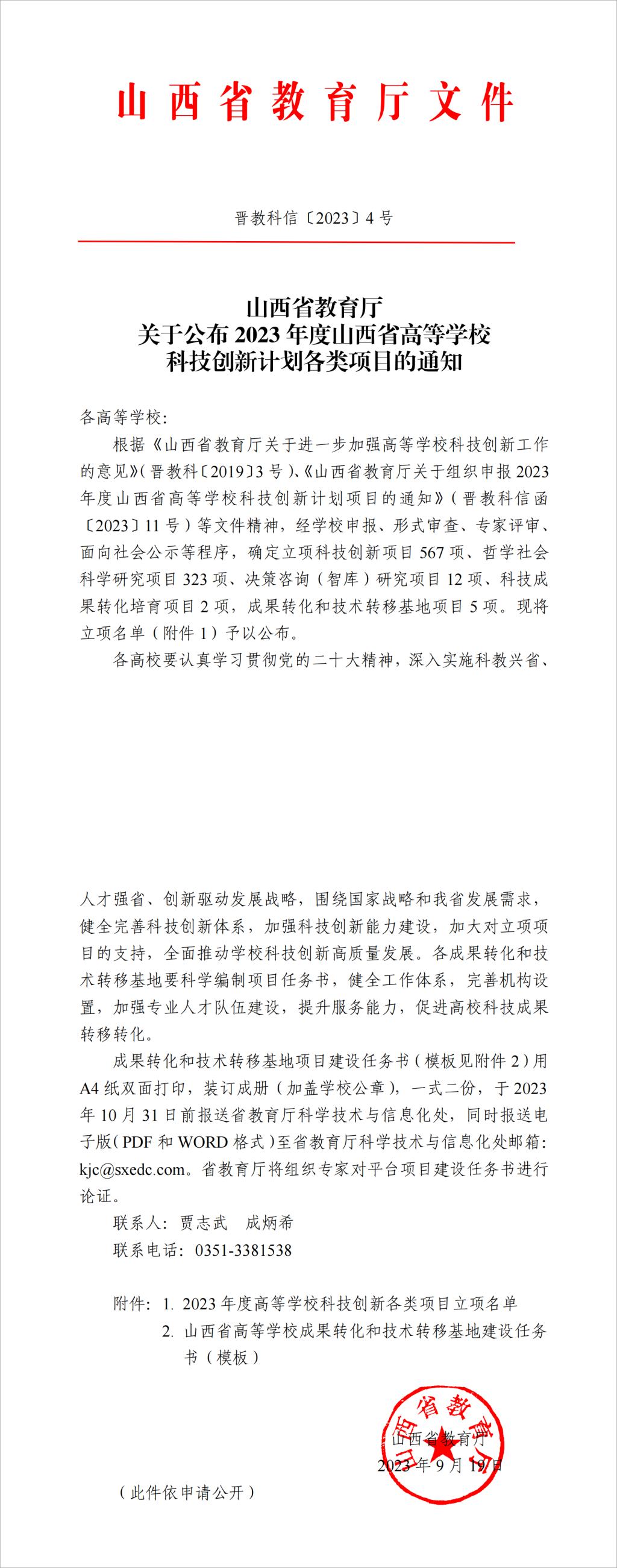 近日,山西省教育厅下发了《山西省教育厅关于公布2023年度山西省高等学校科技创新计划各类项目的通知》(晋教科信〔2023〕4 号),世界杯官网共计获批立项17项,其中2023年山西省高等学校科技创新项目获批16项,2023年山西省高等学校哲学社会科学研究项目获批1项。