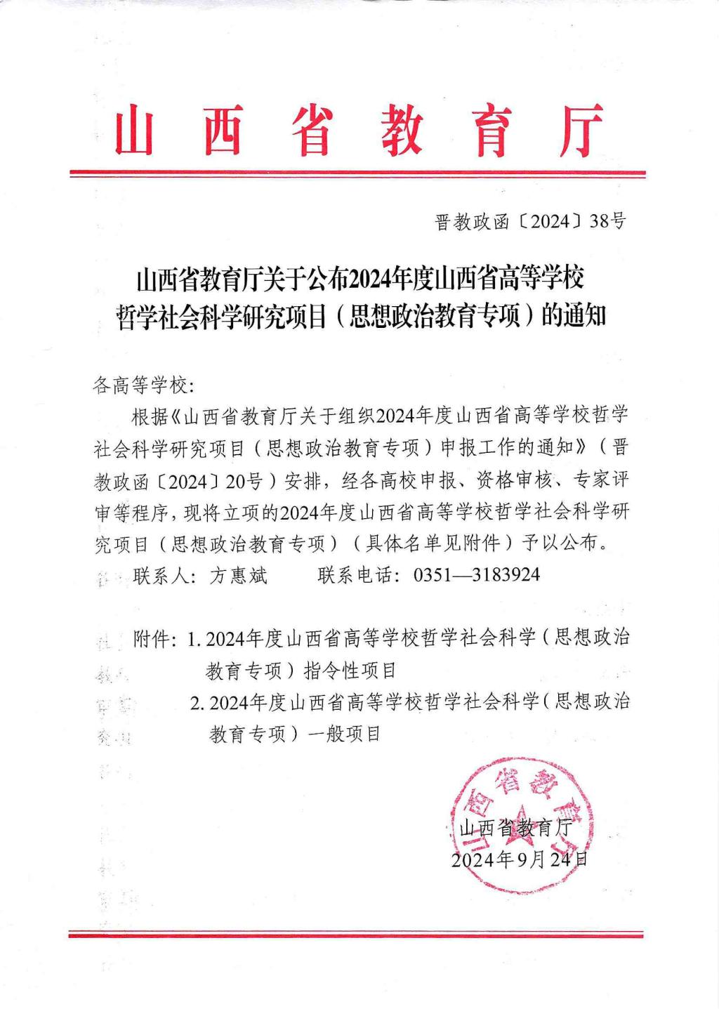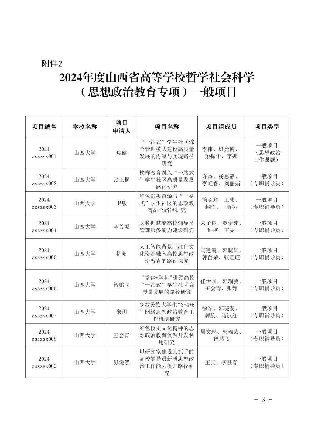 近日,山西省教育厅发布了《山西省教育厅关于公布2024年度山西省高等学校哲学社会科学研究项目(思想政治教育专项)的通知》(晋教政函〔2024〕38号),世界杯官网3项一般项目