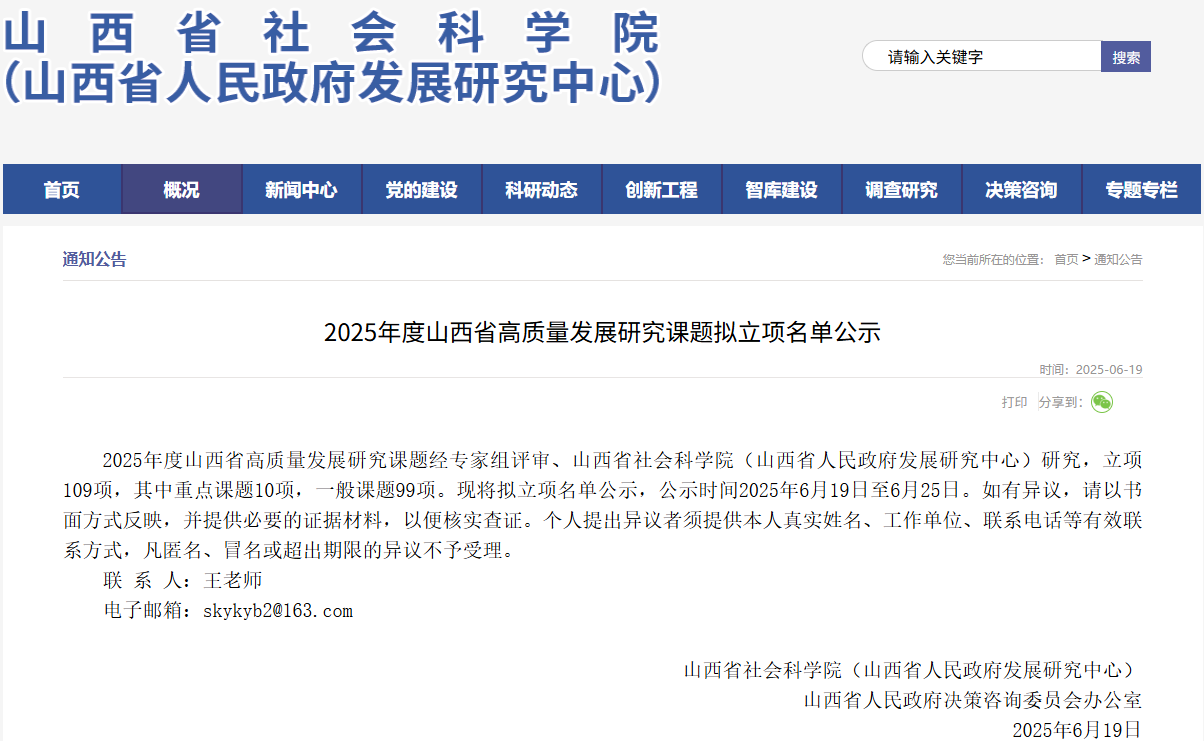 6月19日,山西省社会科学院(山西省人民政府发展研究中心)、山西省人民政府决策咨询委员会办公室发布了“2025年度山西省高质量发展研究课题拟立项名单公示”,世界杯官网获批2项。