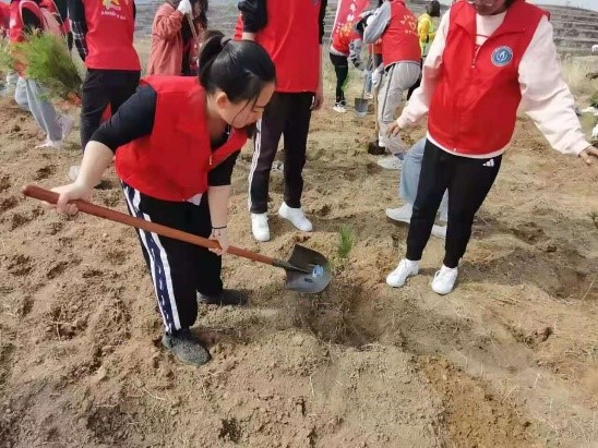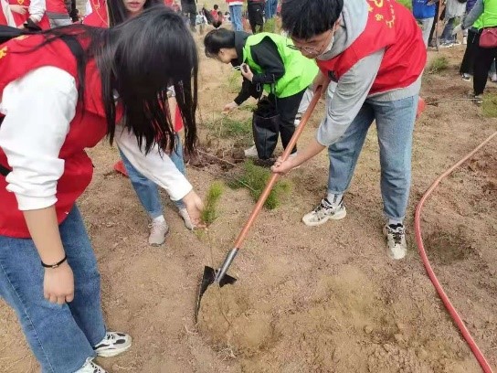 我系志愿者到达目的地之后,听从工作人员的安排,各自分组并拿上铁锹、树苗,热情高涨地投入到植树活动中。
