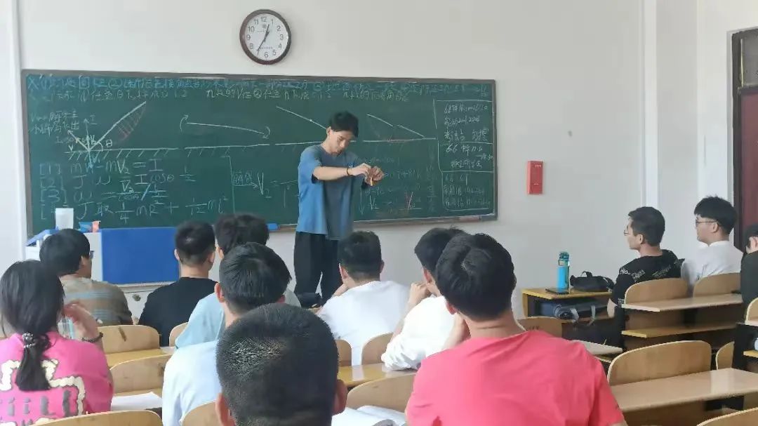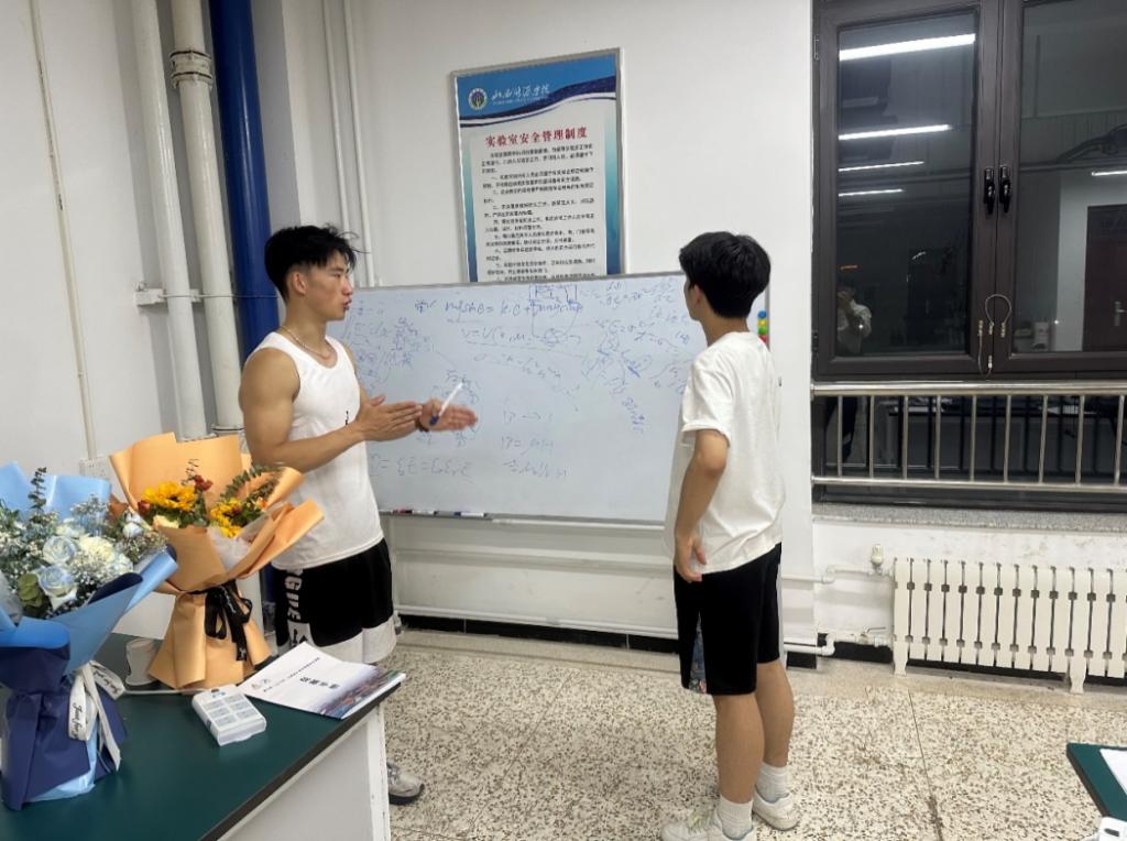 6月1日,物理研学会会长王梓豪作为参赛队员,赛后向新能源2302班杨涛讲解赛题的细节,对接下一步工作。
