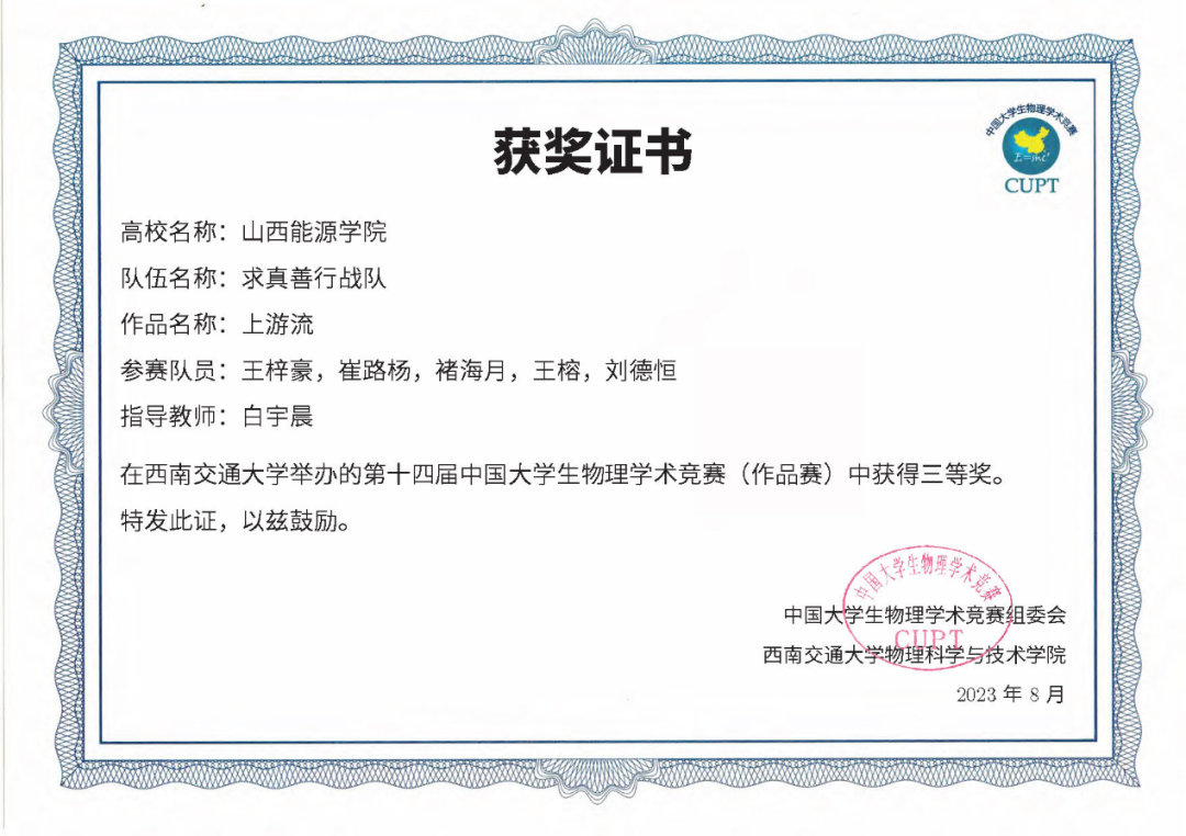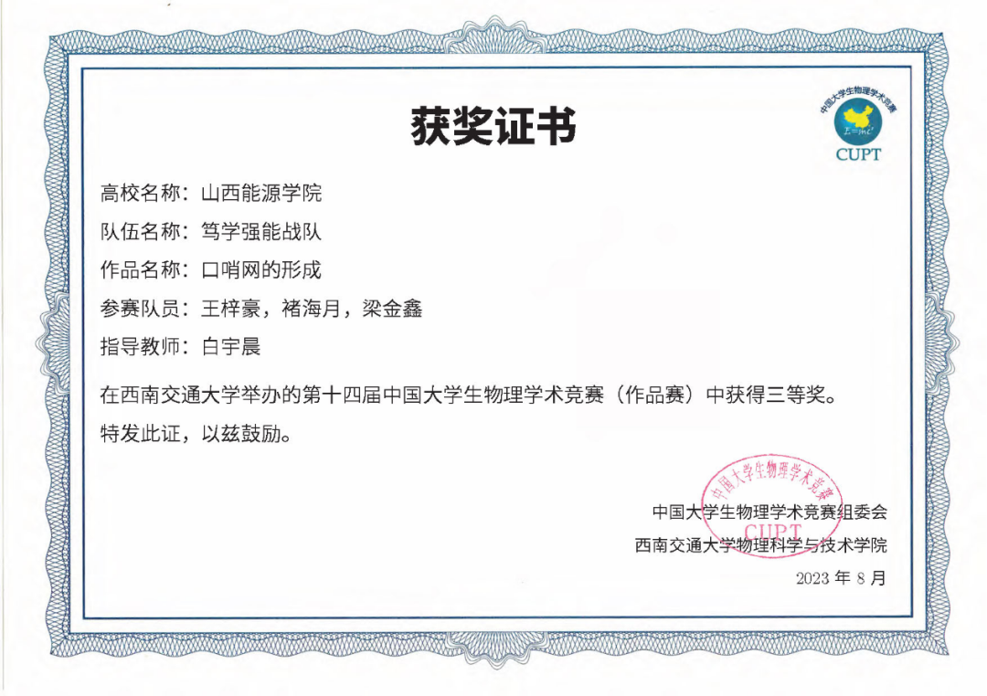 我系活跃在物理研学会的同学获得了诸多奖项,新能源2101王梓豪、新能源2101崔路杨、能动2103褚海月、新能源2201王榕,勇敢地挑战中国大学生物理学术竞赛,并成功获得两项三等奖,这也是世界杯官网首次获得该类奖项!