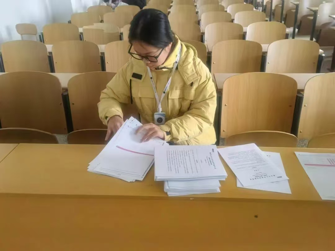 为保障考试顺利进行,考场监考员提前到达考场做好准备工作。