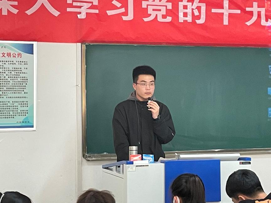 预备党员代表祝路云表示会时刻不忘自己作为一名新青年的使命和担当,持续深入学习党的十九届六中全会精神,不断武装自己的思想,把握时代方向,响应党积极推进科技自立自强的号召,树立专业自信,发挥专业才干,用马克思主义理论武装头脑,将实践观落到实处。善用所学,进一步领会和把握党的百年成就给予我们的重大启示和宝贵经验。