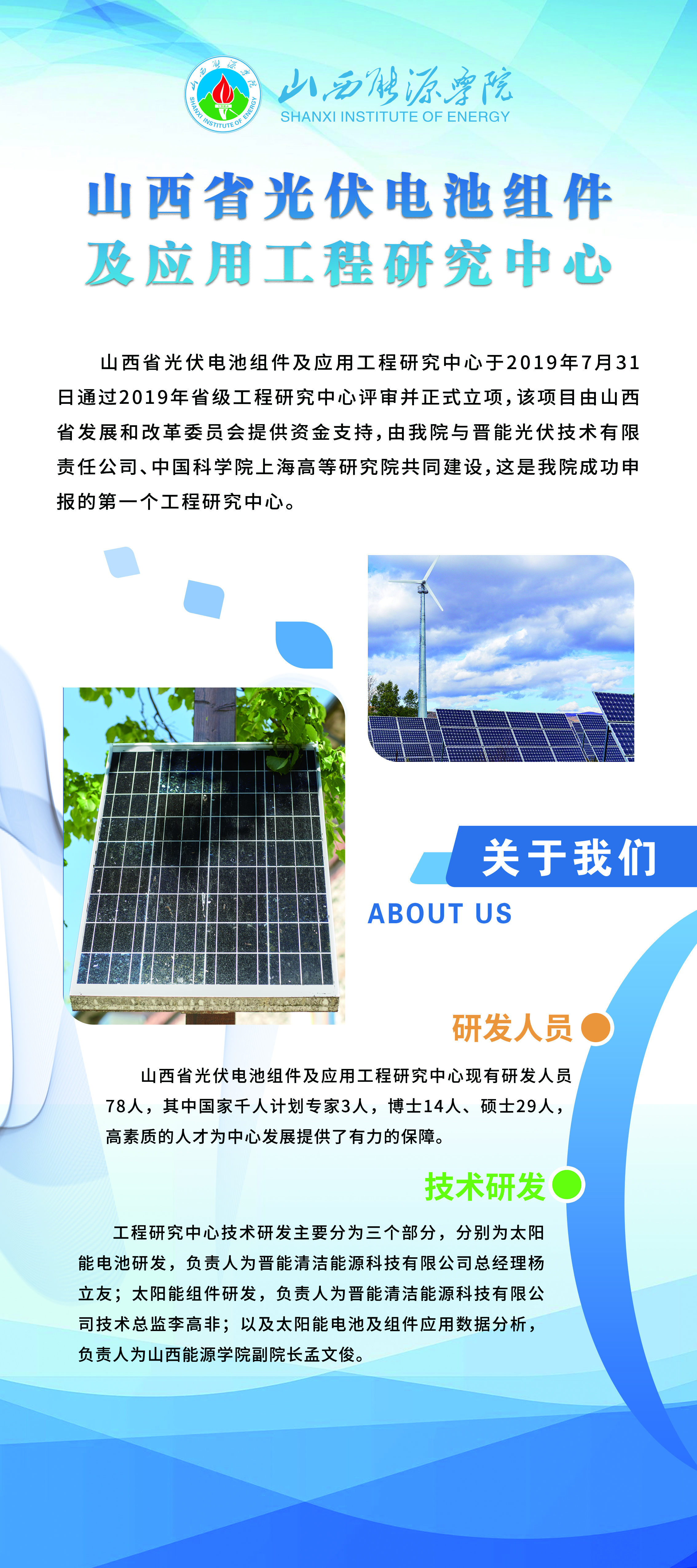 山西省光伏电池组件及应用工程研究中心于2019年7月31日通过2019年省级工程研究中心评审并正式立项,该项目由山西省发展和改革委员会提供资金支持,由我院与晋能光伏技术有限责任公司、中国科学院上海高等研究院共同建设,这是我院成功申报的第一个工程研究中心。