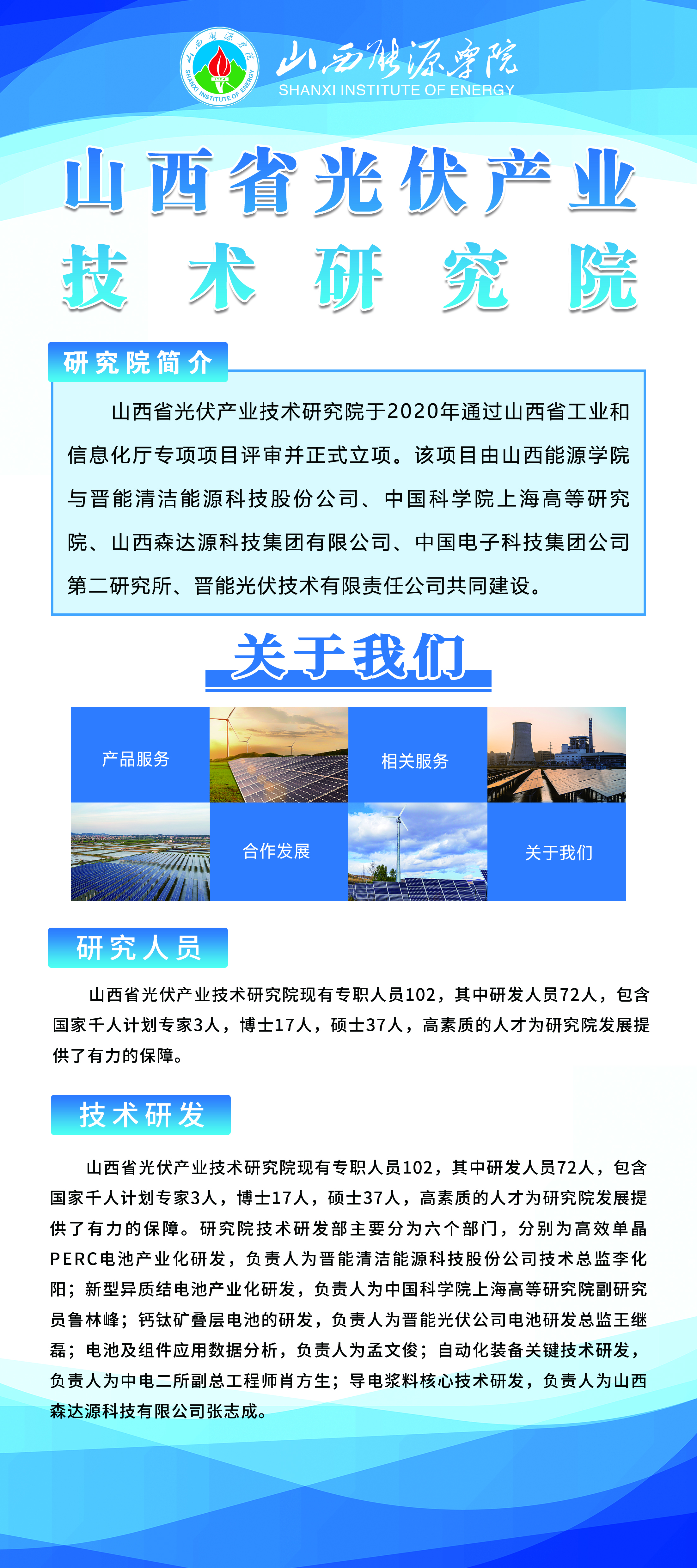 山西省光伏产业技术研究院现有专职人员102,其中研发人员72人,包含国家千人计划专家3人,博士17人,硕士37人,高素质的人才为研究院发展提供了有力的保障。研究院技术研发部主要分为六个部门,分别为高效单晶PERC电池产业化研发,负责人为晋能清洁能源科技股份公司技术总监李化阳;新型异质结电池产业化研发,负责人为中国科学院上海高等研究院副研究员鲁林峰;钙钛矿叠层电池的研发,负责人为晋能光伏公司电池研发总监王继磊;电池及组件应用数据分析,负责人为侯红;自动化装备关键技术研发,负责人为中电二所副总工程师肖方生;导电浆料核心技术研发,负责人为山西森达源科技有限公司张志成。
