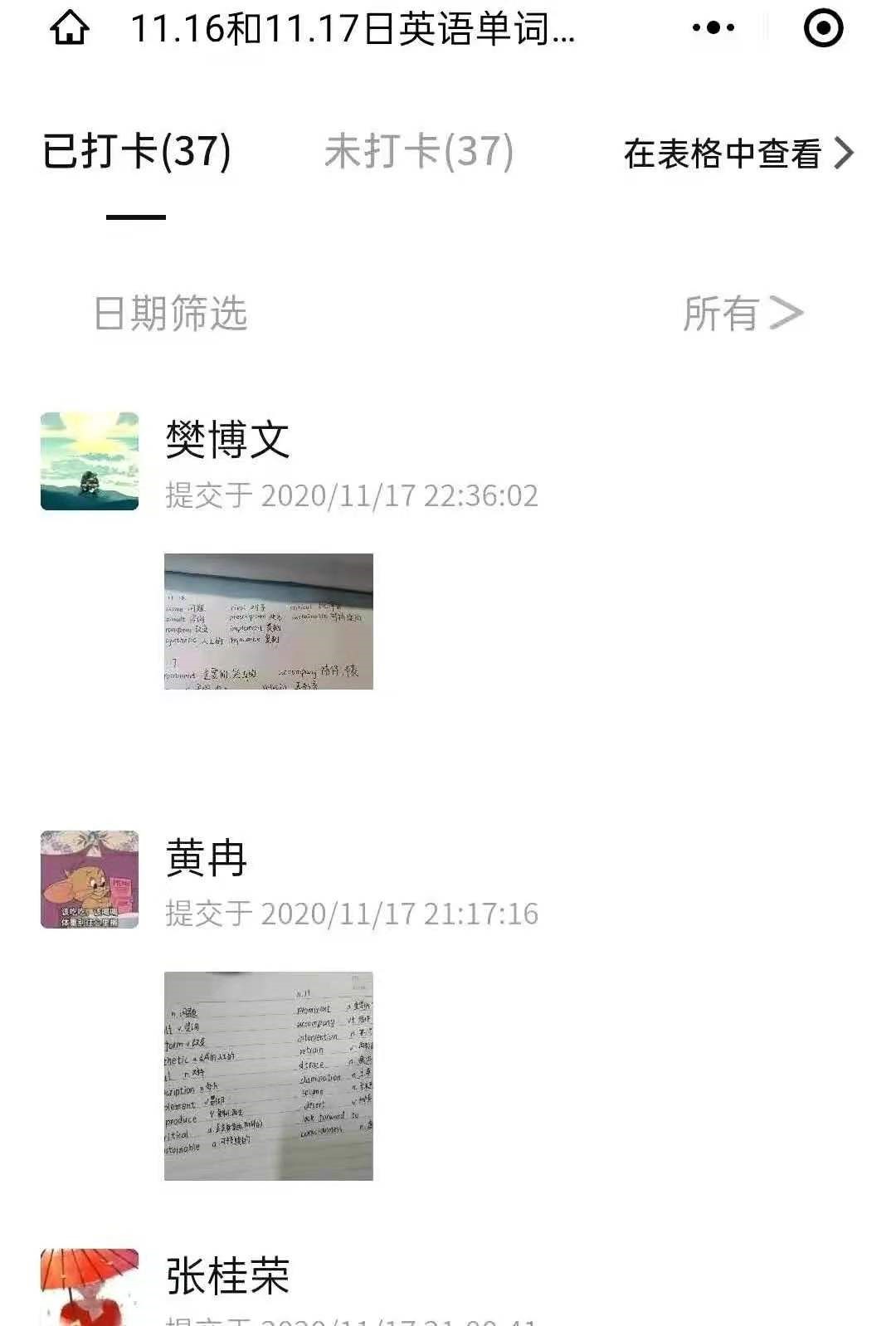 高数每日完成3道题目,每三周进行一次测试。由范敏钧老师将题目发至各班学委,学委下发到小组。通过建立以班级为单位的群聊打卡记录,各班学委将班级打卡记录及时反馈至学委群,由范敏钧老师抽查完成情况并进行指导。