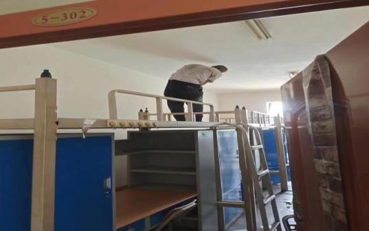 11.学生公寓在暑假期间对所有公寓的床、门、柜进行了维护修理。配合网管维修师傅逐个检查更新了1525间宿舍的网线。物业公司对所管辖区域开展了维护修理和卫生清洁工作,对粉刷过的学生宿舍进行了大清扫。完成新生公寓用品采购工作。