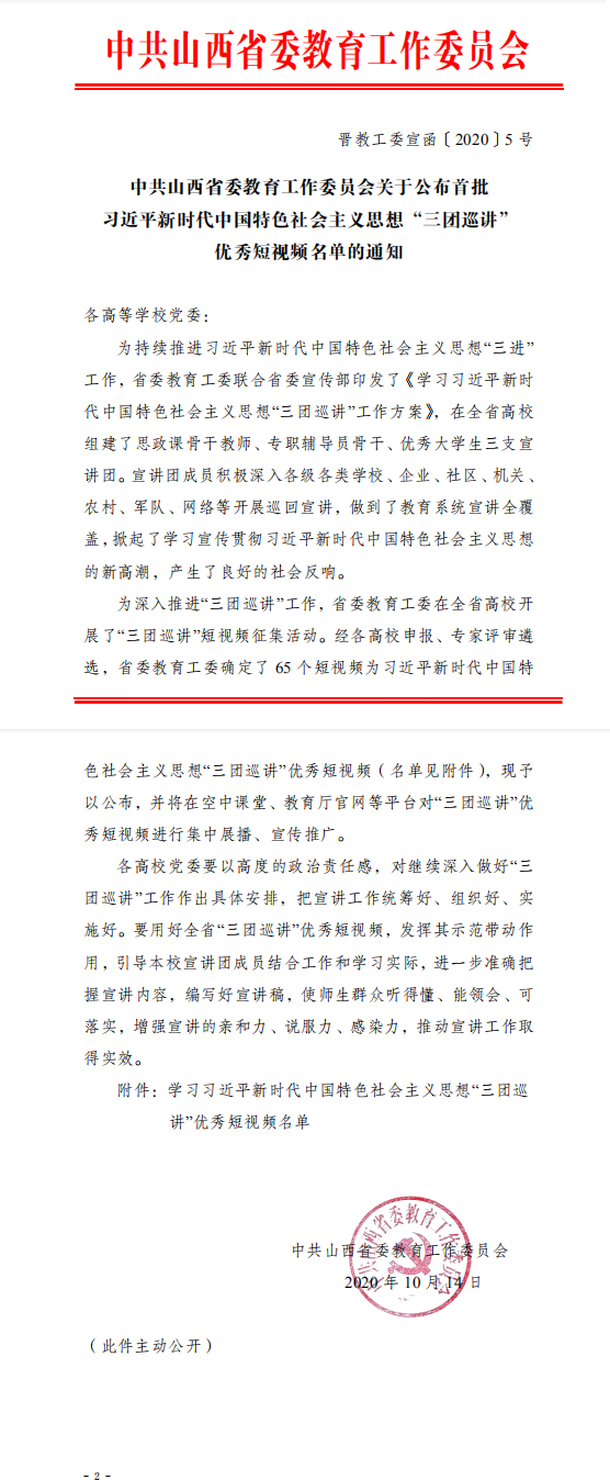 为深入推进“三团巡讲”工作,省委教育工委在全省高校开展了“三团巡讲”短视频征集活动。我院积极申报,经专家评审遴选,最终思想政治理论课教学部马晓亮老师的《从学习党史中感悟和践行共产党员的初心使命》成功入选“三团巡讲”优秀短视频名单。