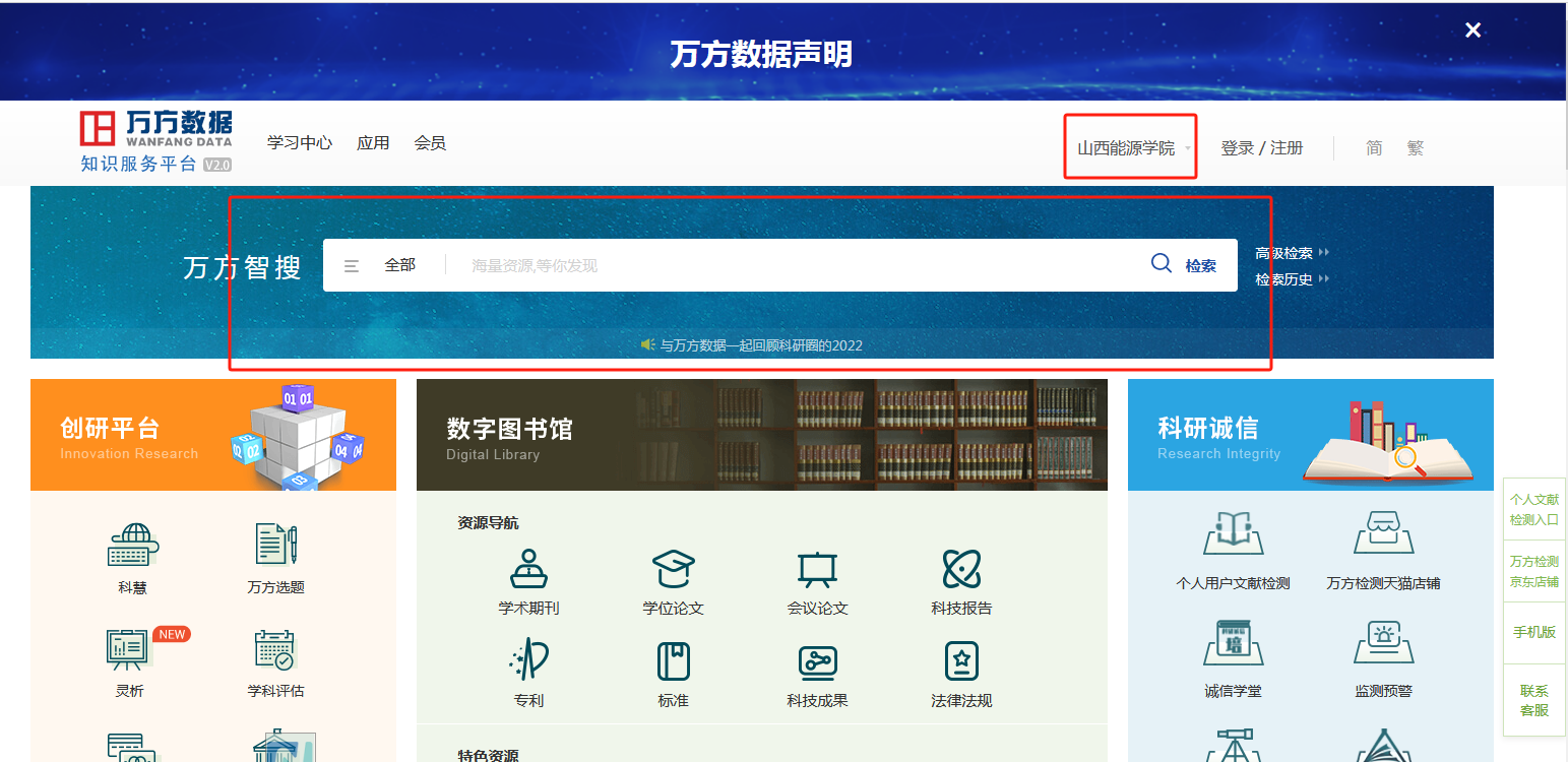 方法二:通过学院图书馆“电子资源”栏目点击万方数据库入口即可登录学校IP账号进入首页。