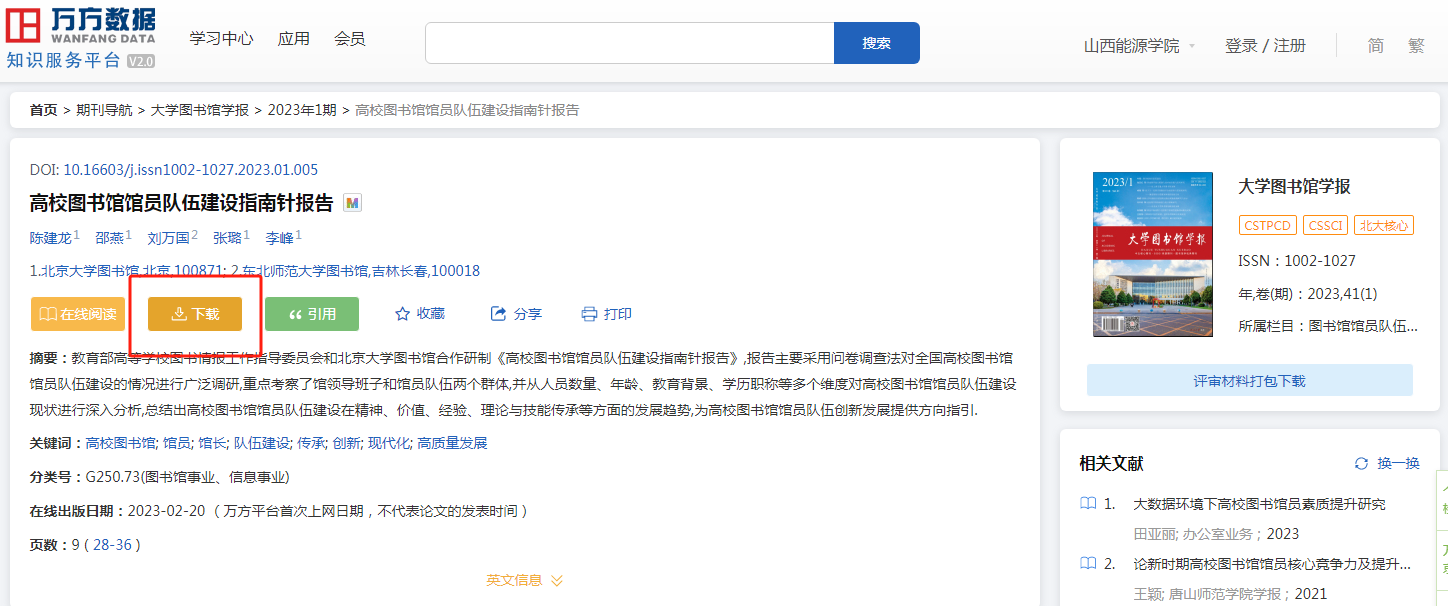 在检索框中输入要检索的关键词,点击检索,即可获得需要的结果。找到所需文献后,点击题名可以进入文献界面,点击下载即可将资源全文下载。