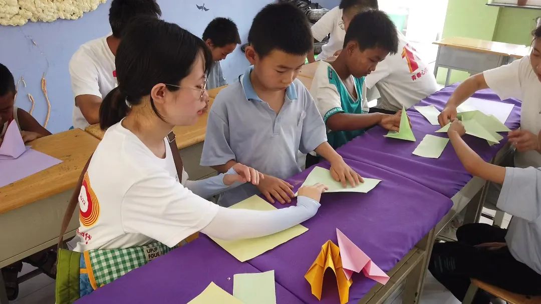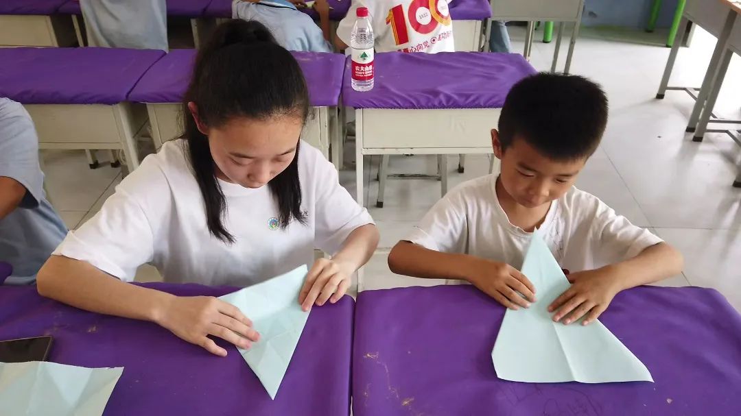 队员们将提前准备好的彩色折纸分发给每个小朋友,并细心地教孩子们折爱心、千纸鹤、飞机。小朋友们开心专注地学习折纸,在队员们的指导下,一张张五颜六色的纸张在小朋友们的手中变化成造型别致的手工作品。在此过程中,提高了小朋友们的动手能力及与人沟通的能力。活动的最后,队员和小朋友们集体放飞手中写有“梦想”的纸飞机,每一枚小小的纸飞机承载的是少年对祖国的热爱,放飞的是对未来美好的憧憬。