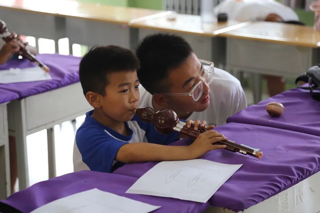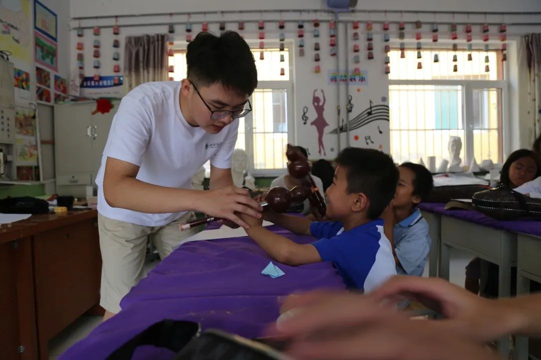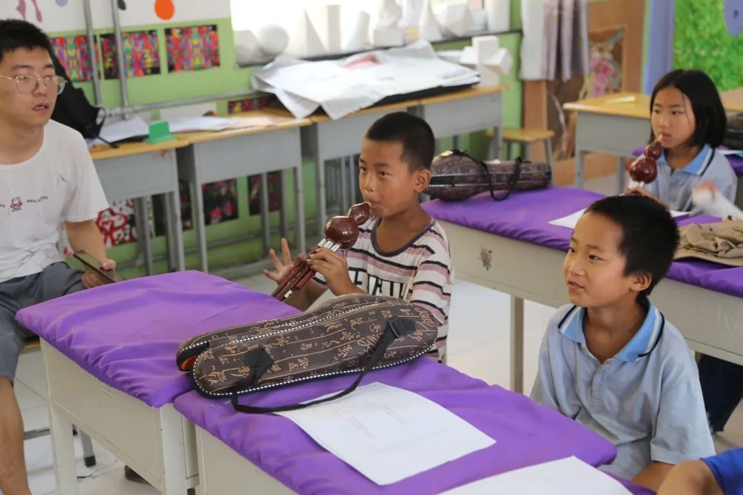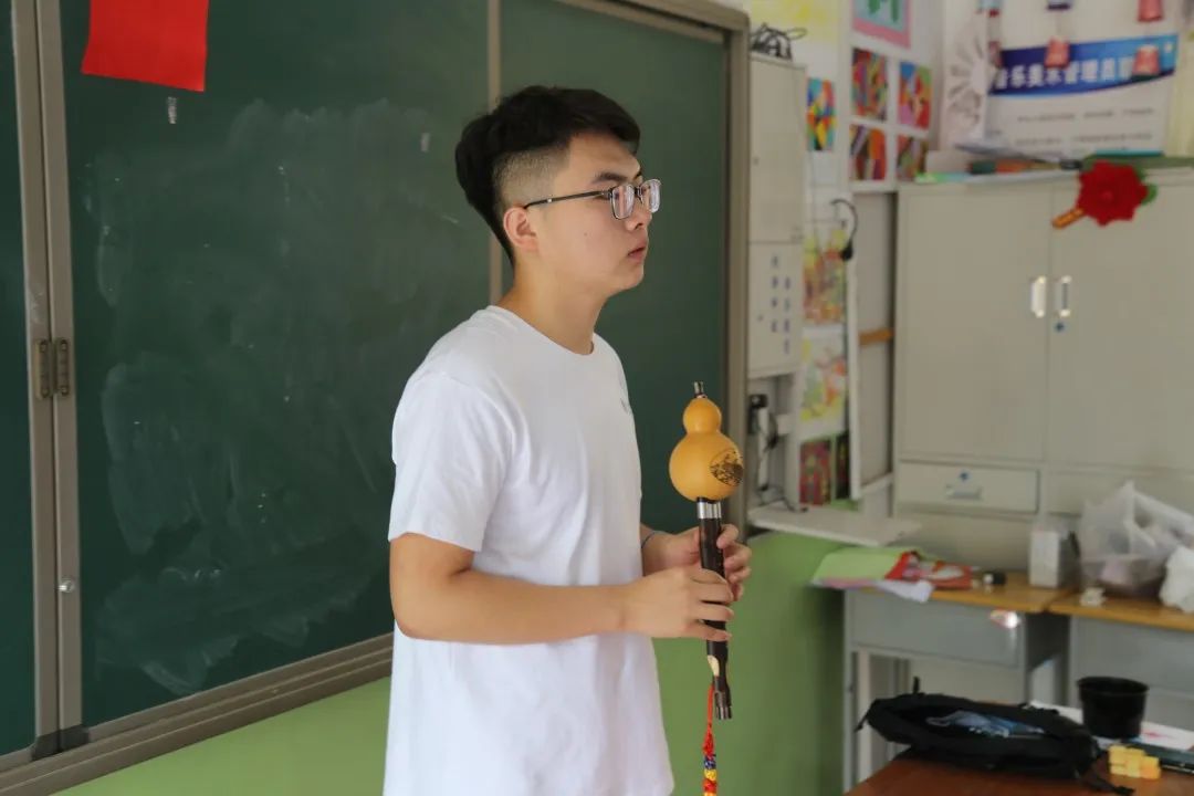 队员白志武为小朋友们带来葫芦丝音乐小课堂。在授课前,他为小朋友们带来了精彩的表演,吹奏《友谊地久天长》与《映山红》,赢得了小朋友们的掌声。授课时,他在黑板上写出《祝福祖国》曲子的简谱,教小朋友们识谱、分句教学。在他与其他队员们的引领下,小朋友们一遍遍的尝试吹响葫芦丝,一一展示学习的成果。以乐器为纽带,让小朋友们通过学习民族乐器了解中华民族的文化传统,激发他们的民族的自豪感与爱国主义精神。