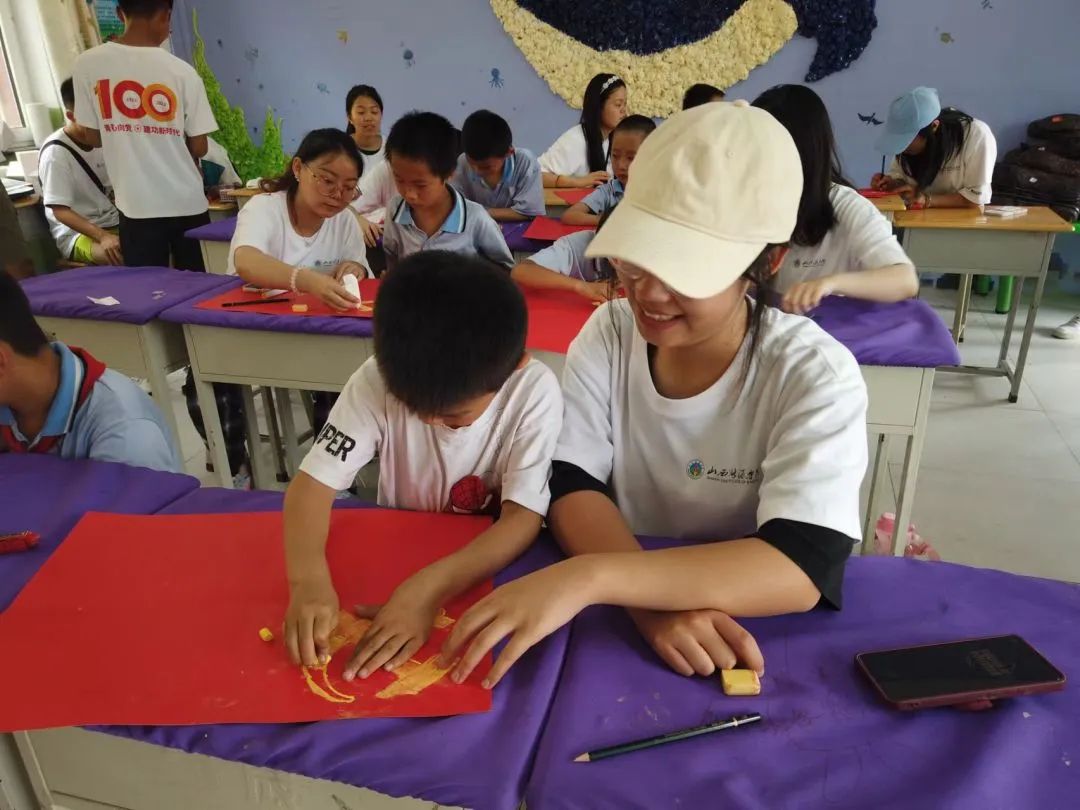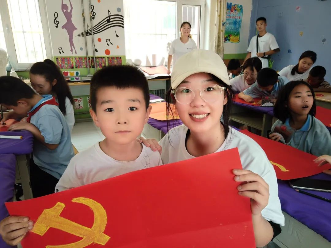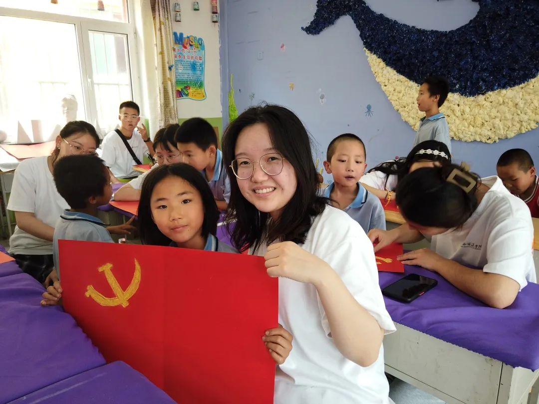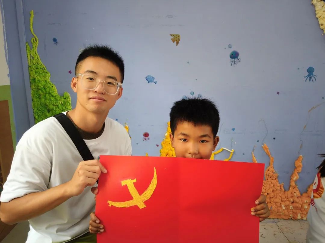 活动伊始,实践队面向湍水头镇寄宿小学的同学们开展美术课堂学画党旗。队员们向小朋友们介绍党旗的构图要素及意义,并手把手地教小朋友们勾勒、上色,大家共同完成了一幅又一幅的作品,他们用稚嫩的笔触描绘出心中党的模样。实践队队员们通过参与式互动的游戏和活泼生动的宣讲,将红色教育的内容以孩子们感兴趣的形式呈现出来,使孩子们在潜移默化中得到红色文化的熏陶。