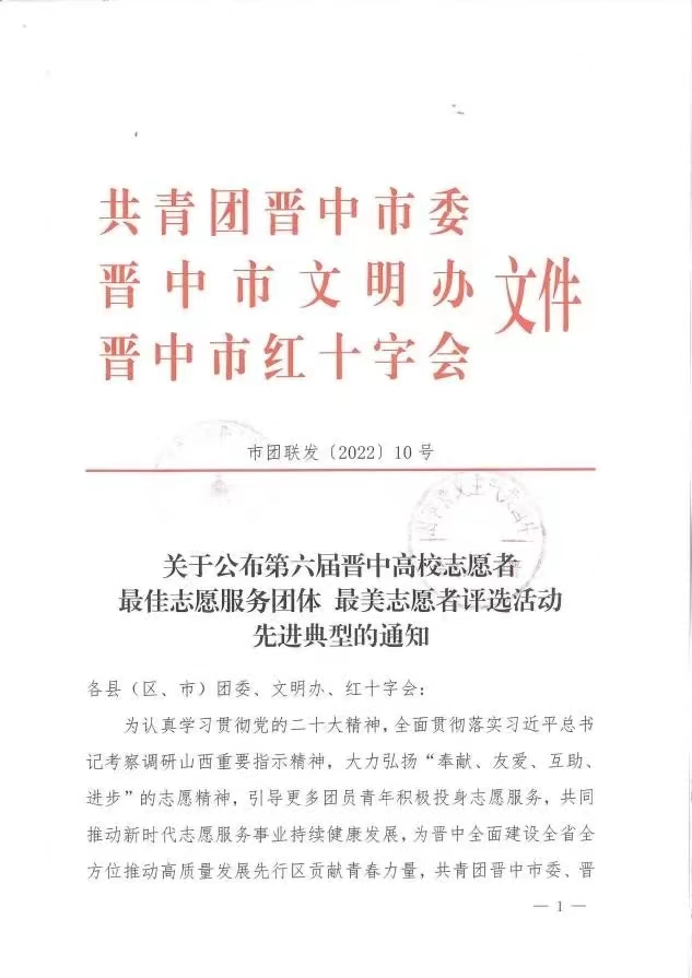 近日,共青团晋中市委、晋中市文明办、晋中市红十字会联合公布了第六届晋中高校志愿者最佳志愿服务团体、最美志愿者评选活动中的先进典型。在此次评选活动中,世界杯官网青年志愿者服务总队荣获“最佳志愿服务团体”奖项,韩亚红、薛吕浩天两位同学获“最美志愿者”提名。
