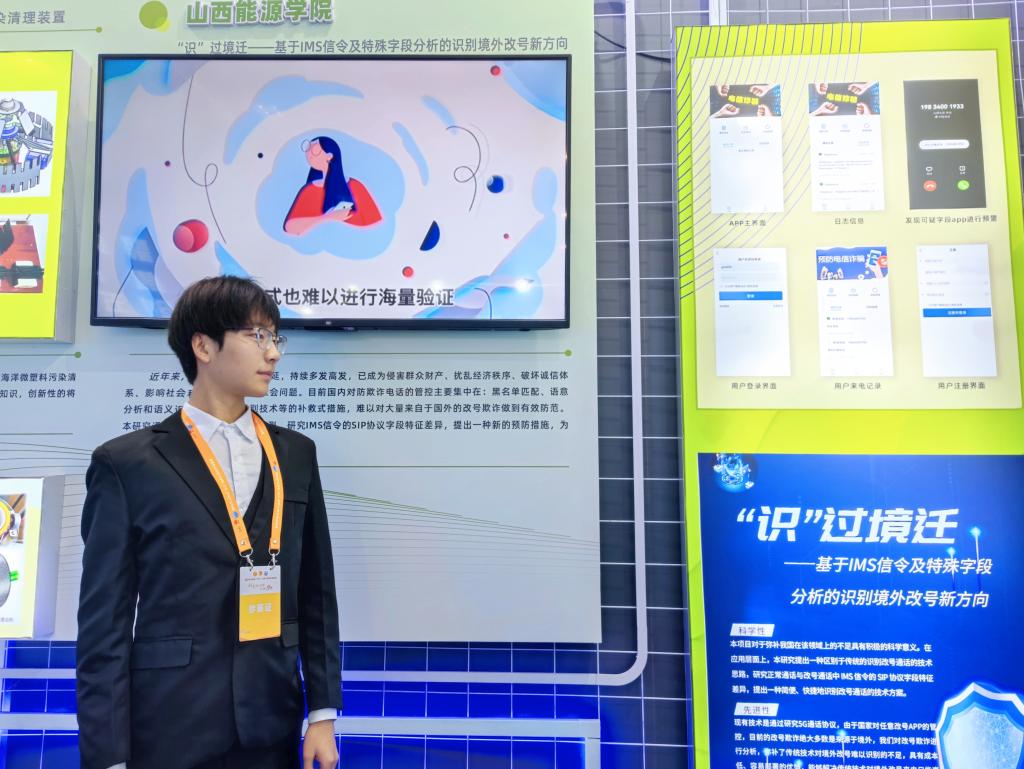 世界杯官网学子通过展板与LED屏对项目进行讲解,向参展人员展示“山能防诈骗App”的经济价值和社会效益。