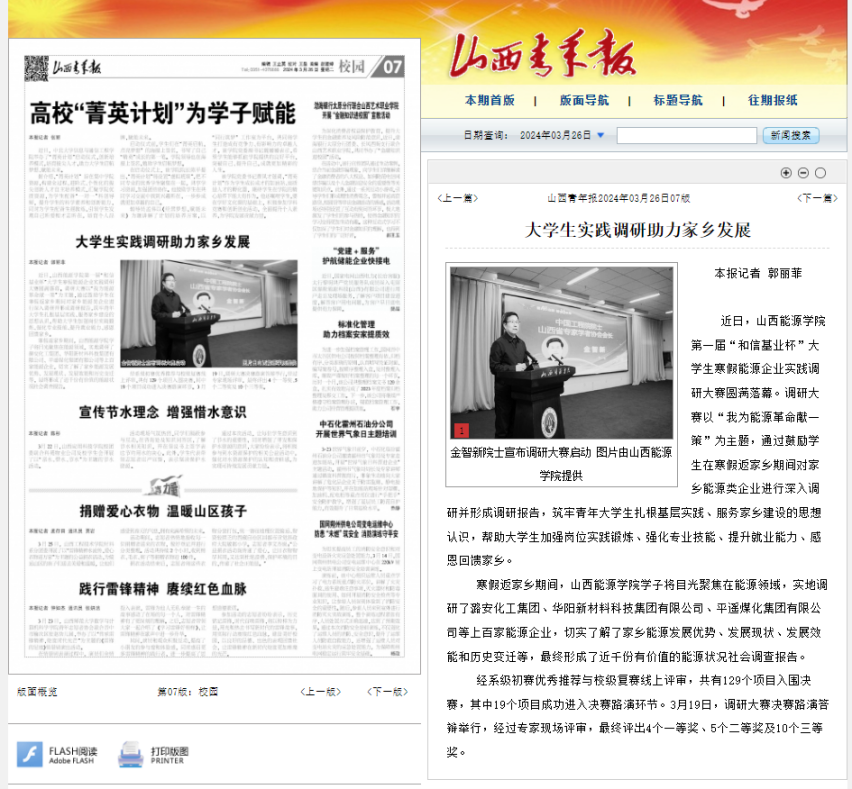 为深入贯彻习近平总书记关于青年工作的重要思想,筑牢青年大学生扎根基层实践、服务家乡建设的思想认识。今年寒假,校团委积极响应团中央、团省委号召,以迎接本科教学工作合格评估为契机,结合共青团基层组织改革,打造了大学生寒假“返家乡”“能源企业‘十百千’”社会实践特色品牌项目,旨在帮助大学生加强岗位实践锻炼、强化专业技能、提升就业能力、感恩回馈家乡。 为了打造好“能源企业‘十百千’”特色品牌项目,在山西和信基业科技股份有限公司的支持下,举办了世界杯官网第一届“和信基业杯”大学生寒假能源企业实践调研大赛。此次活动聚焦能源产业、关注生态环境、对接国家战略,是世界杯官网积极践行习近平生态文明思想,主动对接“美丽中国”建设的重要举措。活动期间,世界杯官网学子利用春节假期及大学生寒假返乡时间,聚集在能源领域有资源禀赋的山西省十个地市,走访了百个县区,深入到各类能源企业中,运用所学专业知识,对企业的能源结构、节能减排措施、技术创新、环保政策执行等情况进行全面而细致的调研,最终形成了近千份有价值的山西能源状况社会调查报告。此次活动还得到了省内媒体——《山西青年报》的报道,充分彰显了世界杯官网在引导青年学子积极投身社会实践,助力国家能源战略实施方面的突出成效,展现了山能学子们的卓越才华和实践能力。