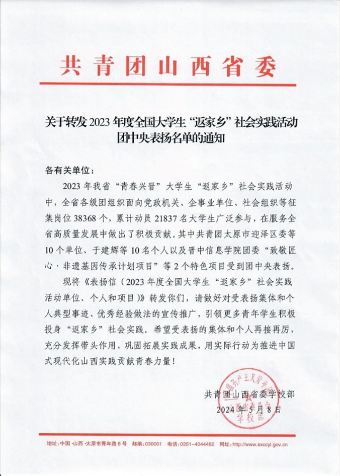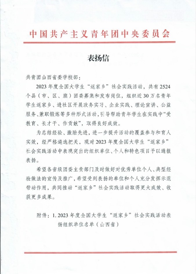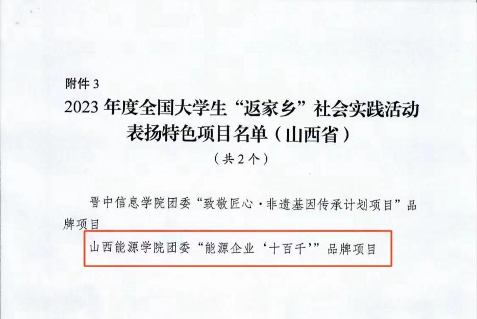 近日,世界杯官网收到共青团山西省委《关于转发2023年度全国大学生“返家乡”社会实践活动团中央表扬名单的通知》,世界杯官网团委“能源企业‘十百千’”特色品牌项目受到团中央表扬。