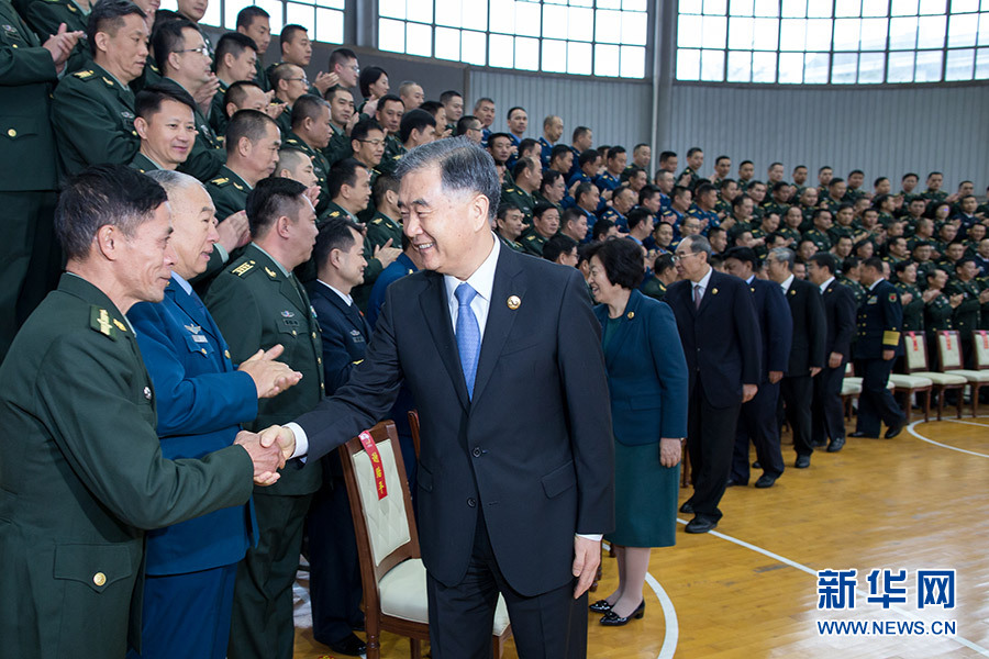 12月9日,中共中央政治局常委、全国政协主席、中央代表团团长汪洋率代表团部分成员分别赴广西军区、武警广西总队慰问,并会见自治区政法系统代表。这是汪洋慰问广西军区和驻桂部队官兵代表。 新华社记者 刘彬 摄