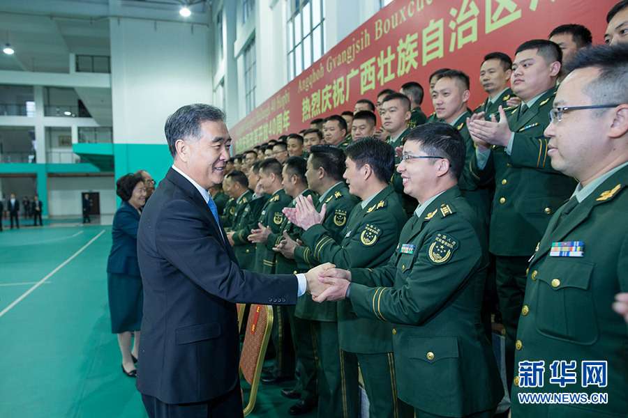 在慰问广西军区和驻桂部队官兵代表时,汪洋指出,广西是英雄的省份,是红色的热土。老一辈革命家在这里书写了中国革命史上光辉一页。广西军区建立以来,一茬接一茬官兵在这里保家卫国、无私奉献,为实现祖国边疆安宁、人民幸福安康作出了重大贡献。你们付出的艰辛努力,取得的光辉业绩,党和政府不会忘记,人民不会忘记。