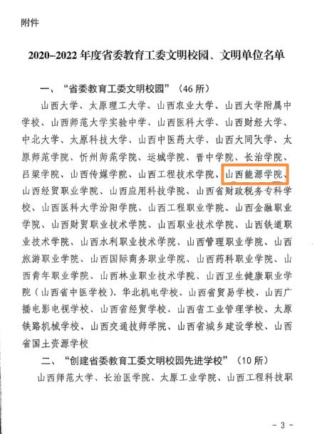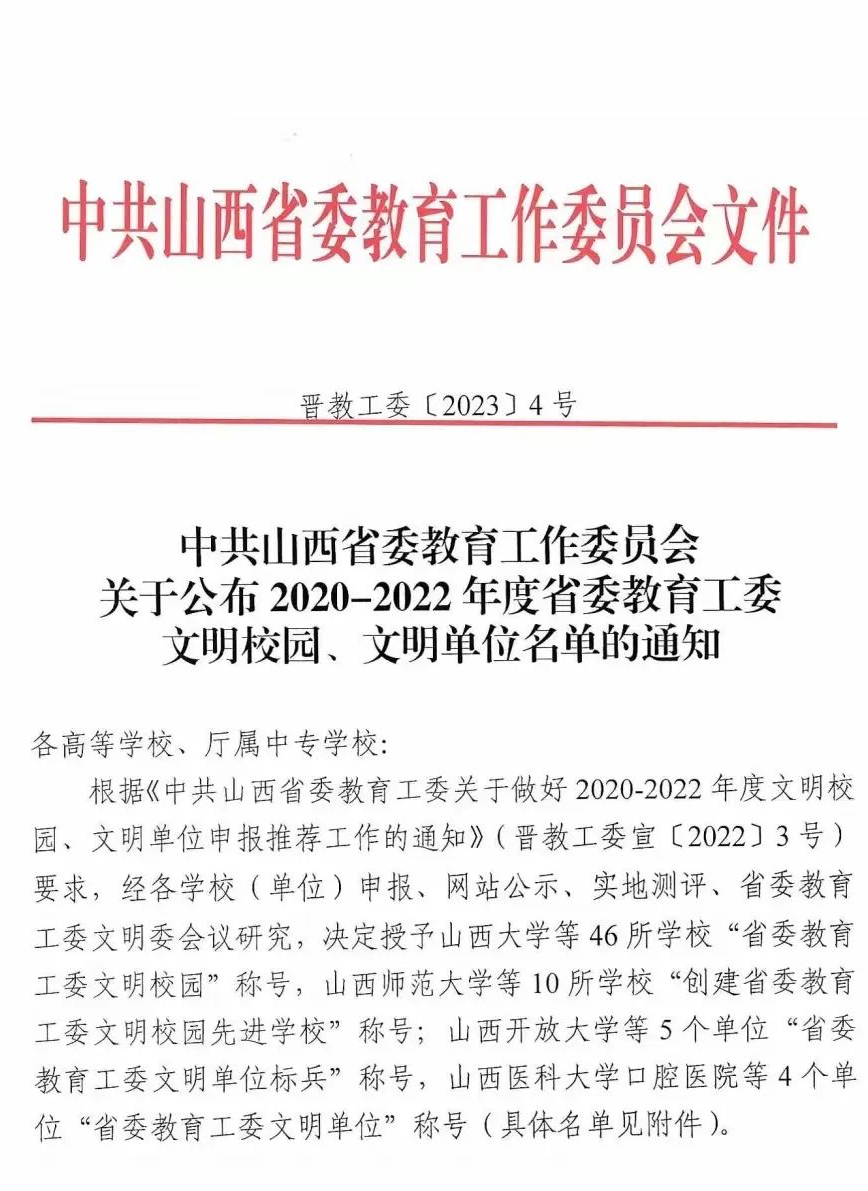 根据中共山西省委教育工委印发的《中共山西省委教育工作委员会关于公布2020-2022年度省委教育工委文明校园、文明单位名单的通知》(晋教工委〔2023〕4号)文件内容,世界杯官网荣获2020-2022年度“省委教育工委文明校园”称号。