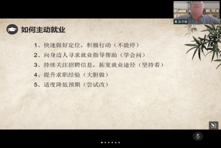 此外,赵书记针对当前存在的“高期望,慢就业”问题提出了四点建议:一、要改变就业观念,合理调整就业期望,树立先就业、再择业观念;二、毕业生要积极大胆,提高积极性,主动把握招聘机会;三、调整心态,就业季面对压力避免患得患失,脚踏实地,合理疏导负面情绪;四、应解放思想,开拓视野,锤炼本领,提高自身的就业竞争力。