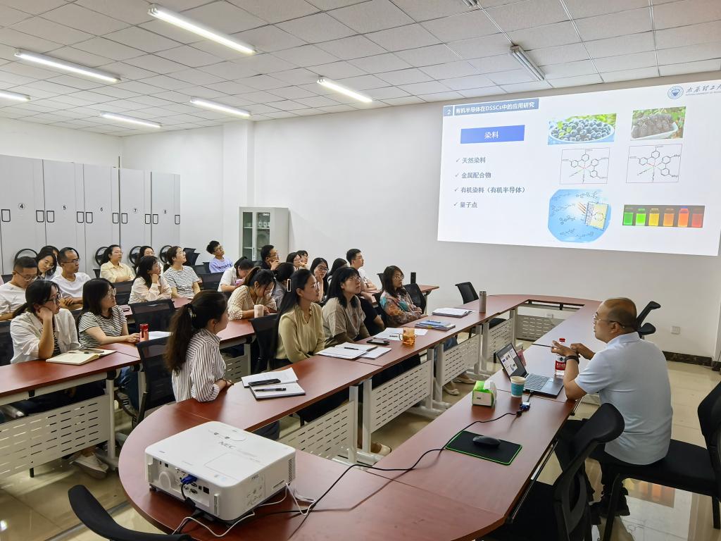 郭教授结合自身科研经历,对新型太阳能电池研究背景和机理进行了详细阐述。随后围绕讲座主题,从有机半导体在染料敏化太阳能电池(DSSCs)应用和螺环空穴传输材料提升钙钛矿太阳能电池(PSCs)性能两方面,分享了自己在科研过程中的宝贵经验与独到见解。在讲解过程中,郭教授展示了其团队在新型太阳能电池领域的最新研究成果,这些成果引发了在场师生的强烈兴趣。