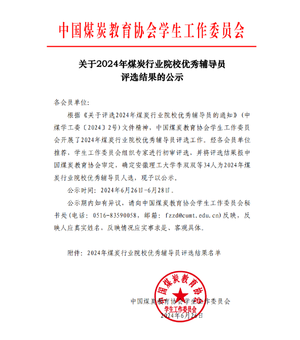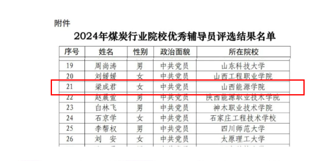 近日,中国煤炭教育协会学生工作委员印发了《关于2024年煤炭行业院校优秀辅导员评选结果的公示》,我院计算机与信息工程系专职辅导员梁成君荣获2024年煤炭行业院校“优秀辅导员”称号。