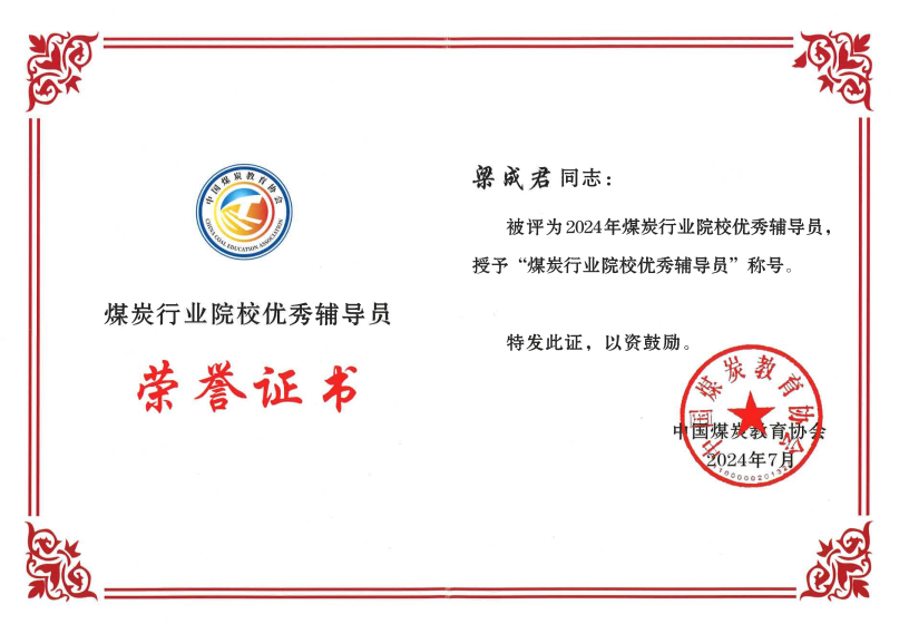 我院辅导员梁成君荣获2024年煤炭行业院校“优秀辅导员”称号