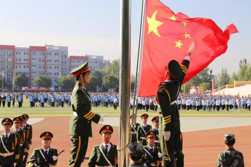 上午9时,慷慨激昂的国歌拉开了典礼的序幕,国旗在庄严的国歌声中缓缓升起,在场师生全体起立,合唱国歌。